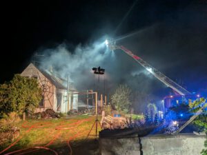 In der Nacht von Donnerstag auf Freitag kam es in Sennfeld zu einem Brand in einem Wohngebäude. Aufgrund der raschen Brandausbreitung erhöhte die Leitstelle Schweinfurt die Alarmstufe auf B4, was den Alarm weiterer Feuerwehren sowie des Gerätewagens Atemschutz/Strahlenschutz nach sich zog.