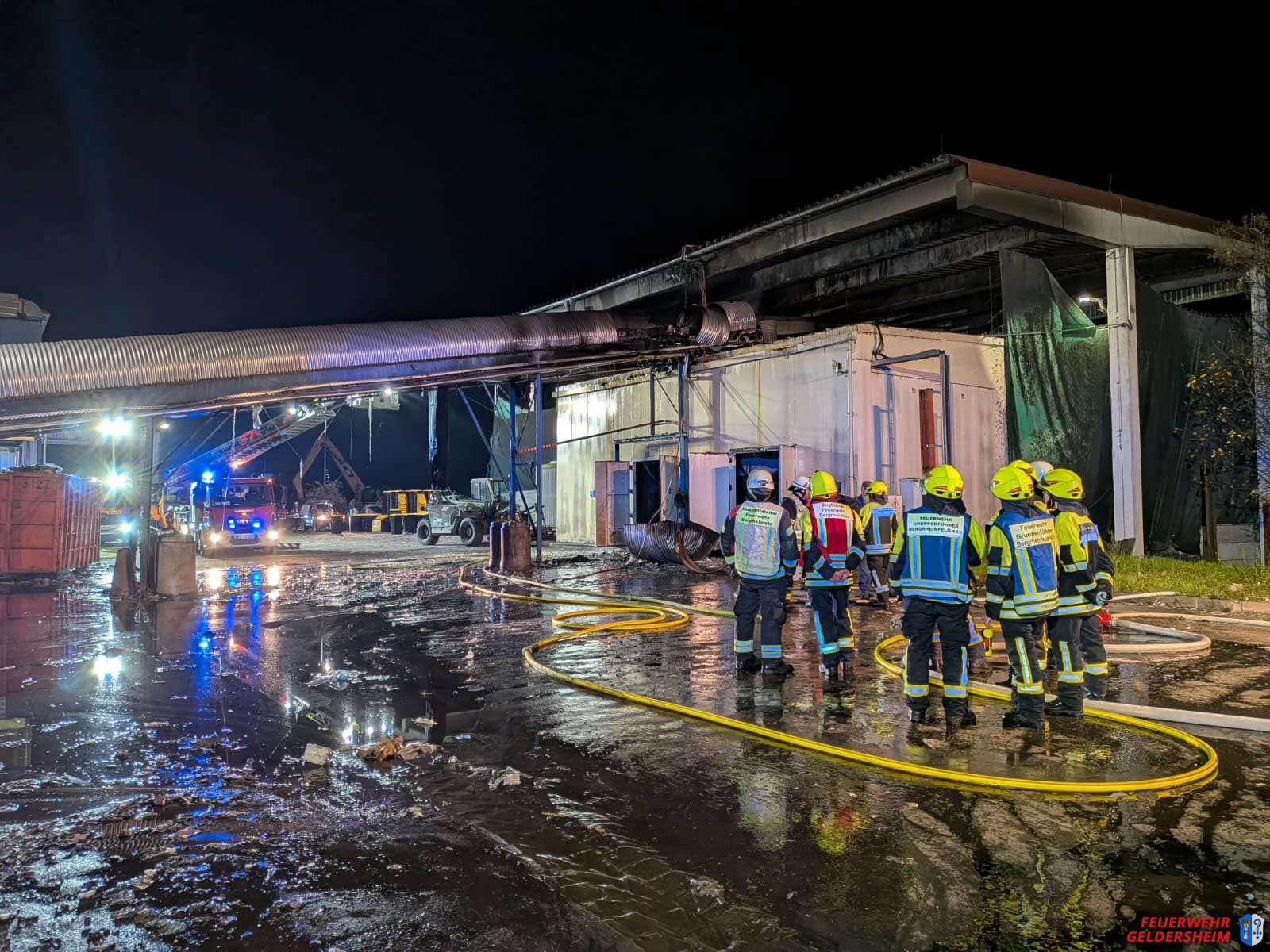 Die Feuerwehr Geldersheim rückte mit dem Gerätewagen Atemschutz aus, um im Bedarfsfall Atemschutzgeräte an die beteiligten Feuerwehren ausgeben zu können. Nachdem die Löschmaßnahmen zügig Erfolg gezeigt hatten, war dies nicht mehr erforderlich. Die Feuerwehr Geldersheim rückte gegen 00:30 Uhr wieder am Standort ein.