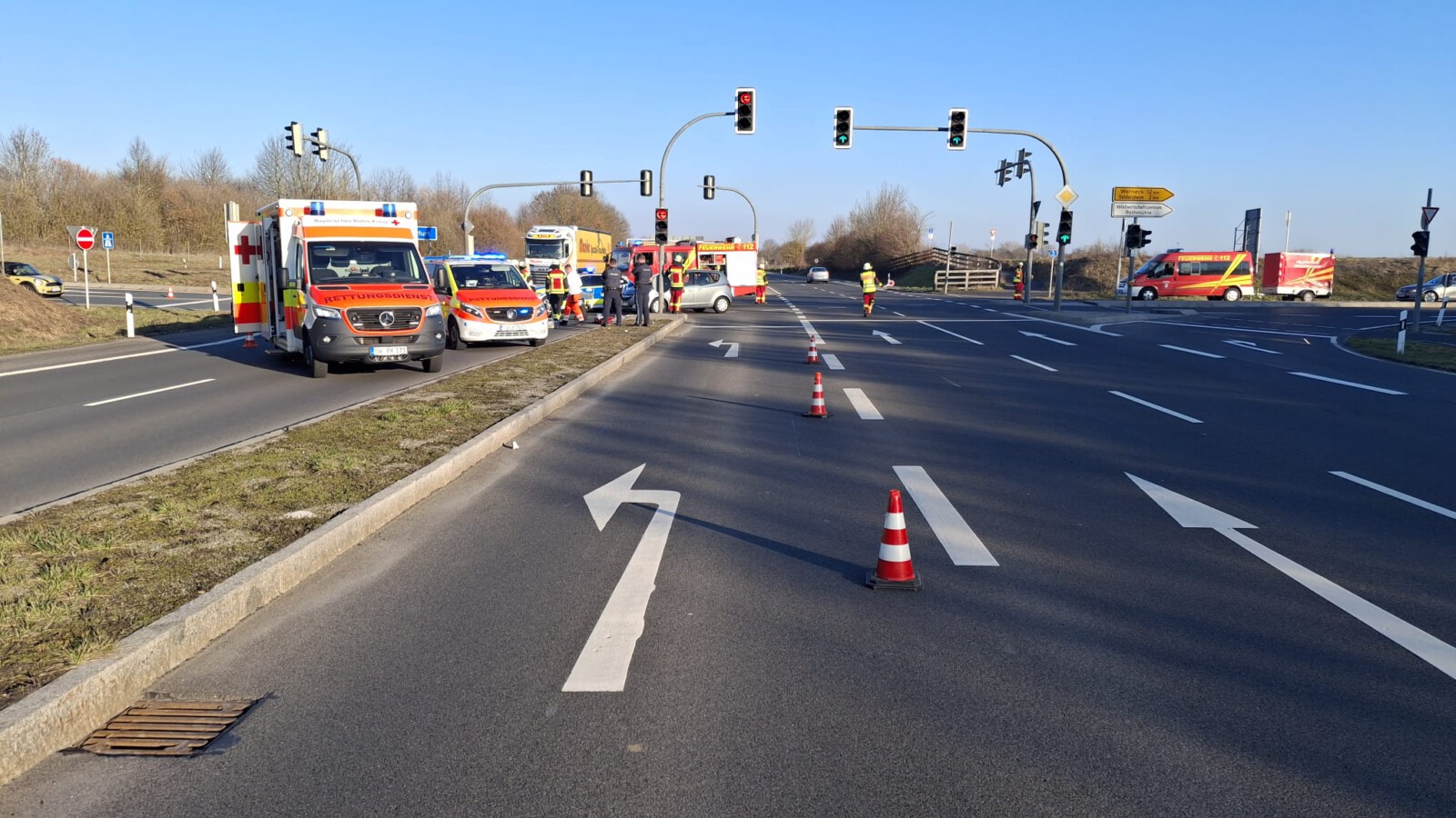 Währenddessen sicherten wir die Einsatzstelle gegen den fließenden Verkehr ab und errichteten einen Sichtschutz zum Schutz der Verletzten. Die Polizei hat die Ermittlungen zum genauen Unfallhergang aufgenommen.